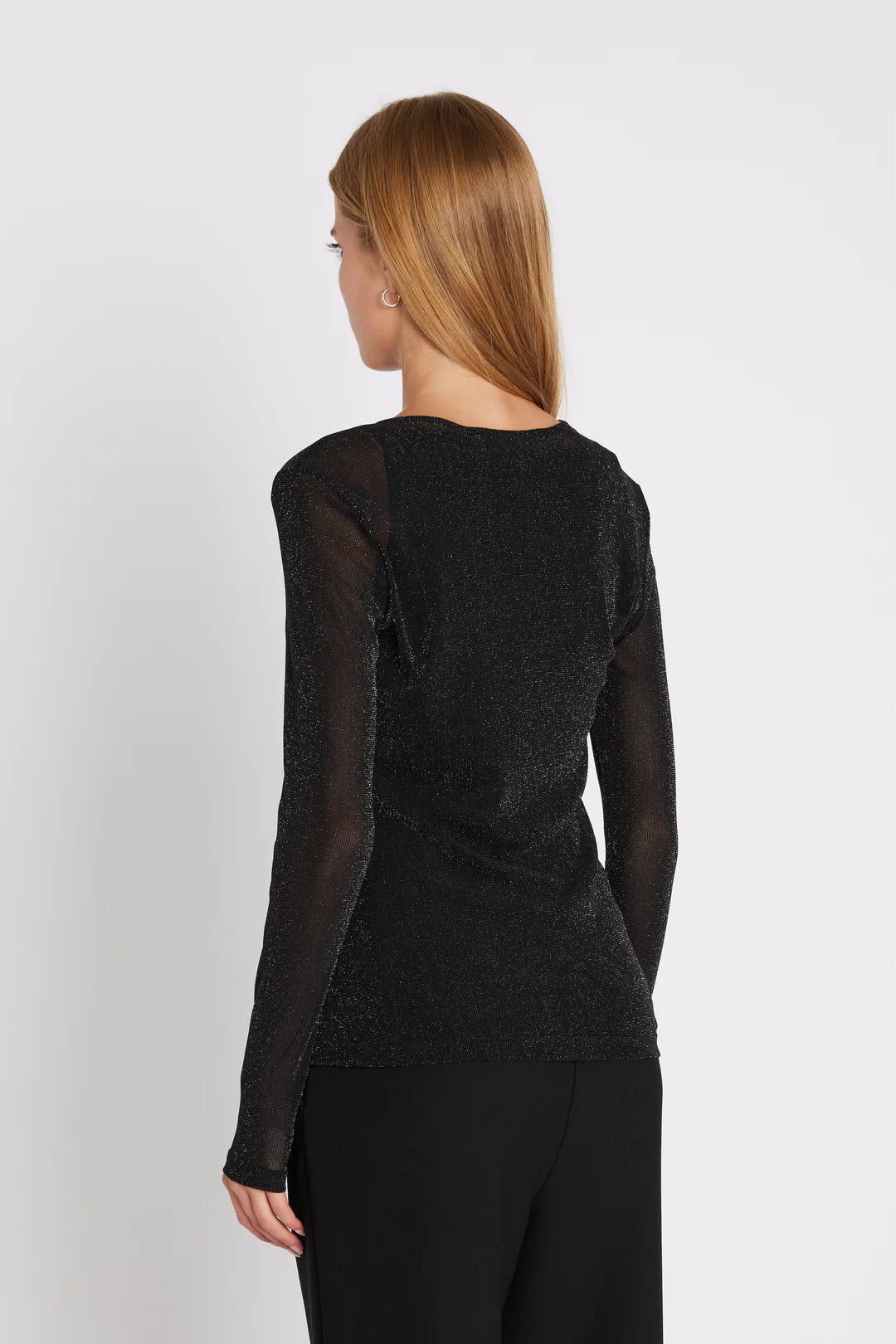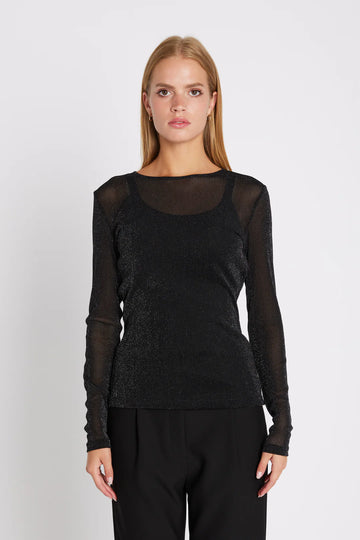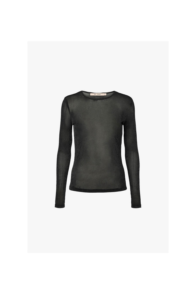 T-shirt élégant et simple avec un col rond et des manches longues. La matière légèrement transparente crée une silhouette féminine avec une touche moderne discrète.
