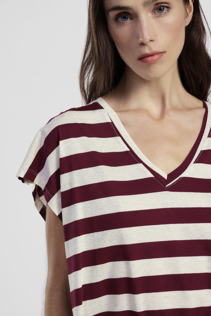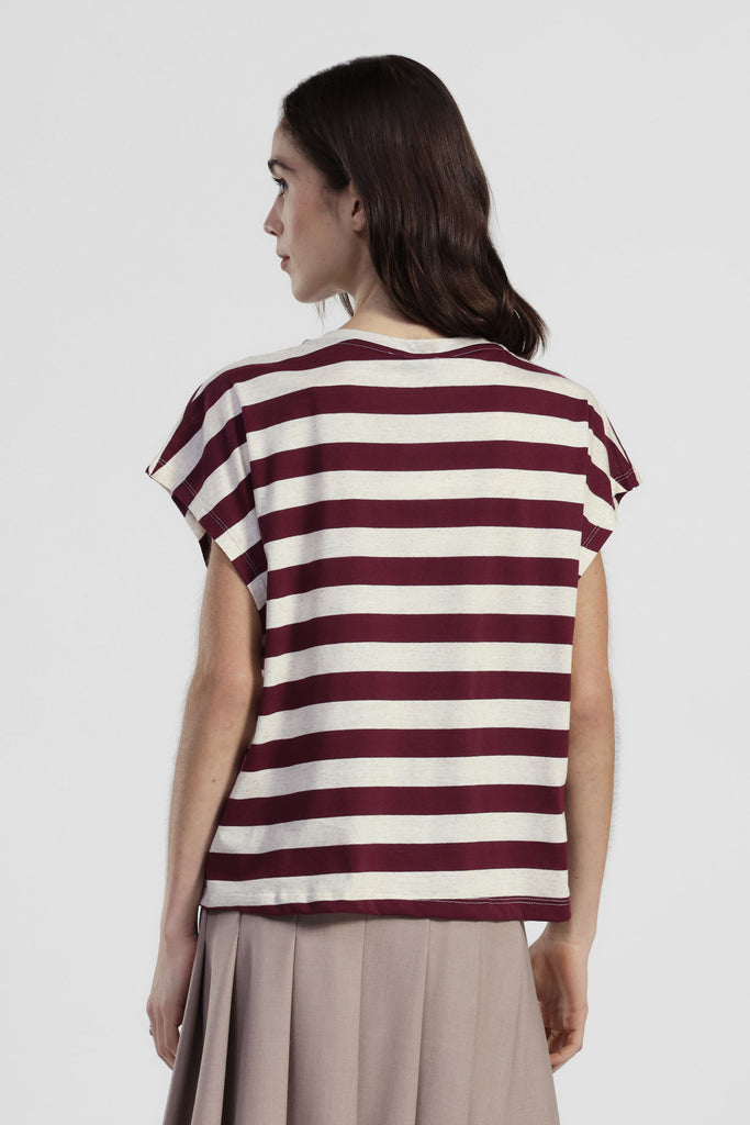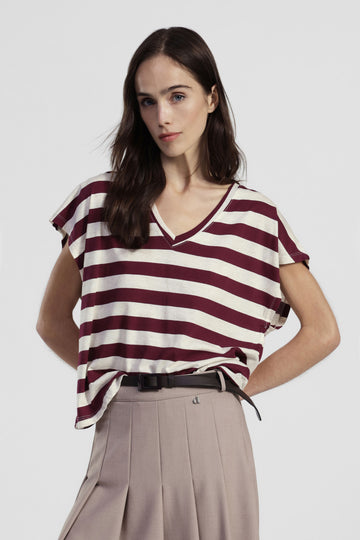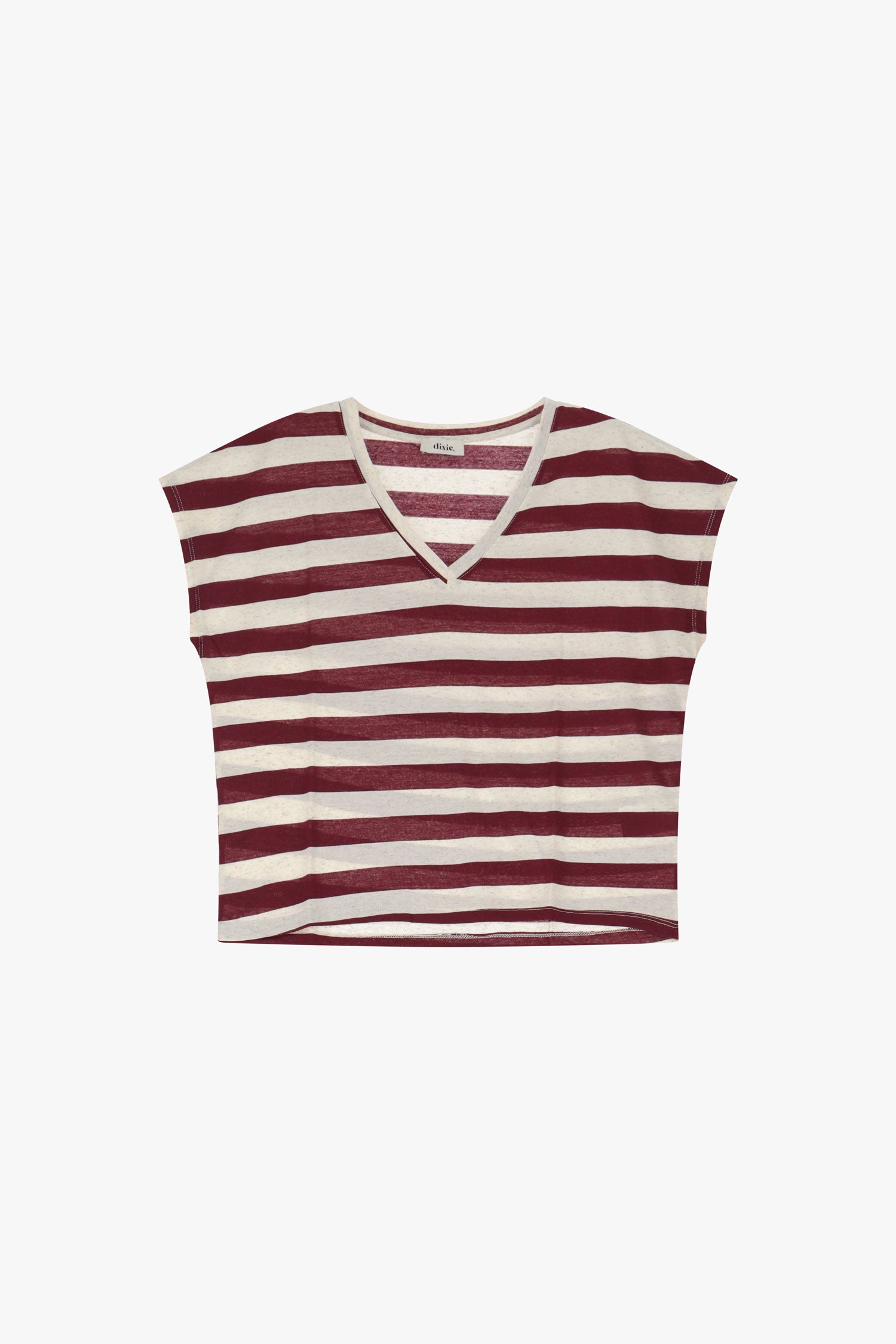 Parfaite pour un look quotidien, cette t-shirt à rayures offre un ajustement doux et confortable. Le col en v ajoute une touche de féminité, tandis que les manches courtes la rendent idéale pour la saison chaude. À associer à un jean ou un pantalon décontracté pour une tenue simple mais soignée.